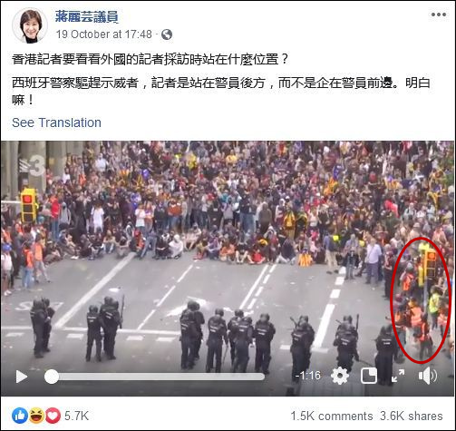 19日,香港特區立法會議員蔣麗芸在社交媒體上曬出壹段西班牙警察驅散並逮捕示威者的視頻,她的關注點落在壹旁拍攝的記者身上:他們在警察的身後或身旁拍攝,並沒有將鏡頭懟上警察的臉,妨礙執法。
