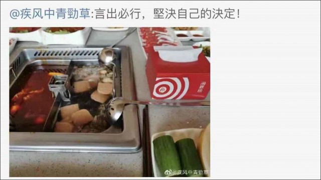 到了昨天,港警@疾風中青勁草 就曬出了在深圳吃海底撈的截圖,並配文“言出必行”;