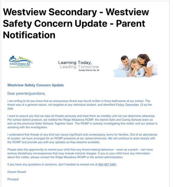 Ridge Meadows RCMP確認了正對42學區西景中學收到不明的槍擊威脅進行調查,這些槍擊威脅信息是匿名寫在學校叁個衛生間裡。