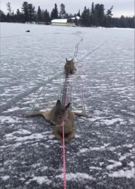壹邊滑冰,壹邊將3只鹿拖到岸邊。然後,鹿慢慢站起來。