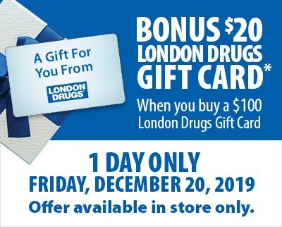 (加西网综合)London Drugs 推出一天限时优惠,在各门店购买$100礼品卡(Gift Card)额外赠送$20礼品卡,优惠仅限今天(12月20日)或售完即止。【