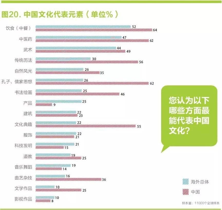 反觀我們,《中國國家形象全球調查報告》顯示,中國整體形象得分為及格線的6.2分。其中,最能代表中國文化的叁大元素分別是中餐、中醫、武術。