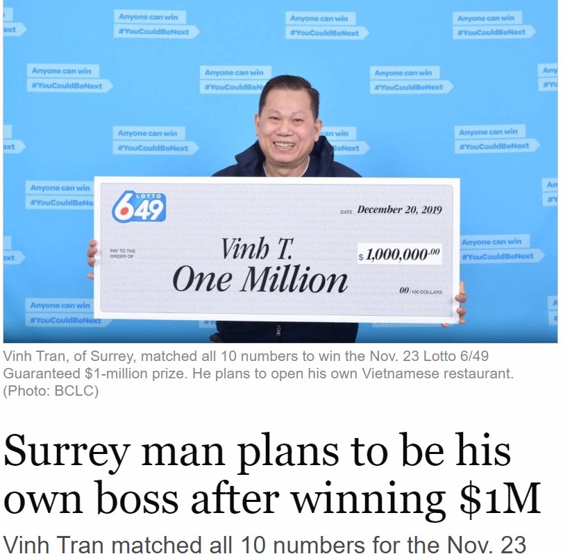 Vinh Tran自2015年起開始投注BC/49和至多彩(Lotto Max)。他這次中的獎金是11月23日開出來的Lotto 6/49。