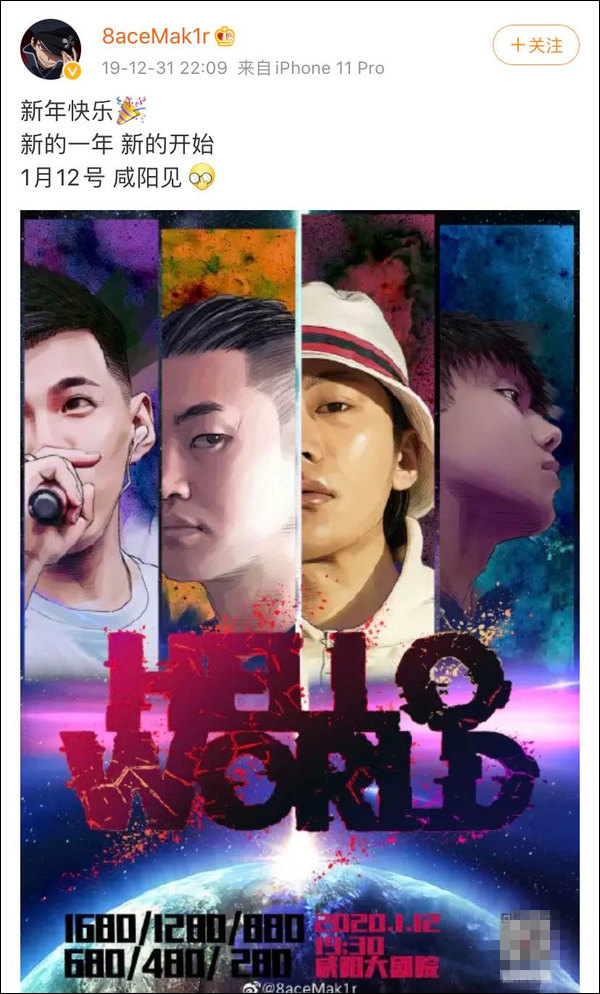 跨年之夜(2019年12月31日),說唱歌手PG One@8aceMak1r 突然發文宣布了自己的內地演出並寫道:1月12號,鹹陽見。