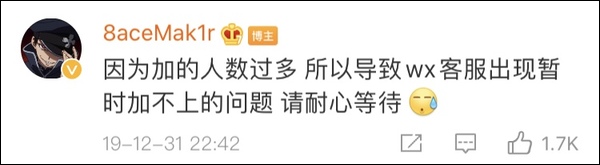觀察者網1月2日查詢發現,該場演出的票務信息並未出現在任何票務網站,而是需要通過添加微信客服購買,但目前該微信賬號添加人數過多,已經暫停添加請求。對此,PG One在其微博下也做出回應,稱需“耐心等待”。