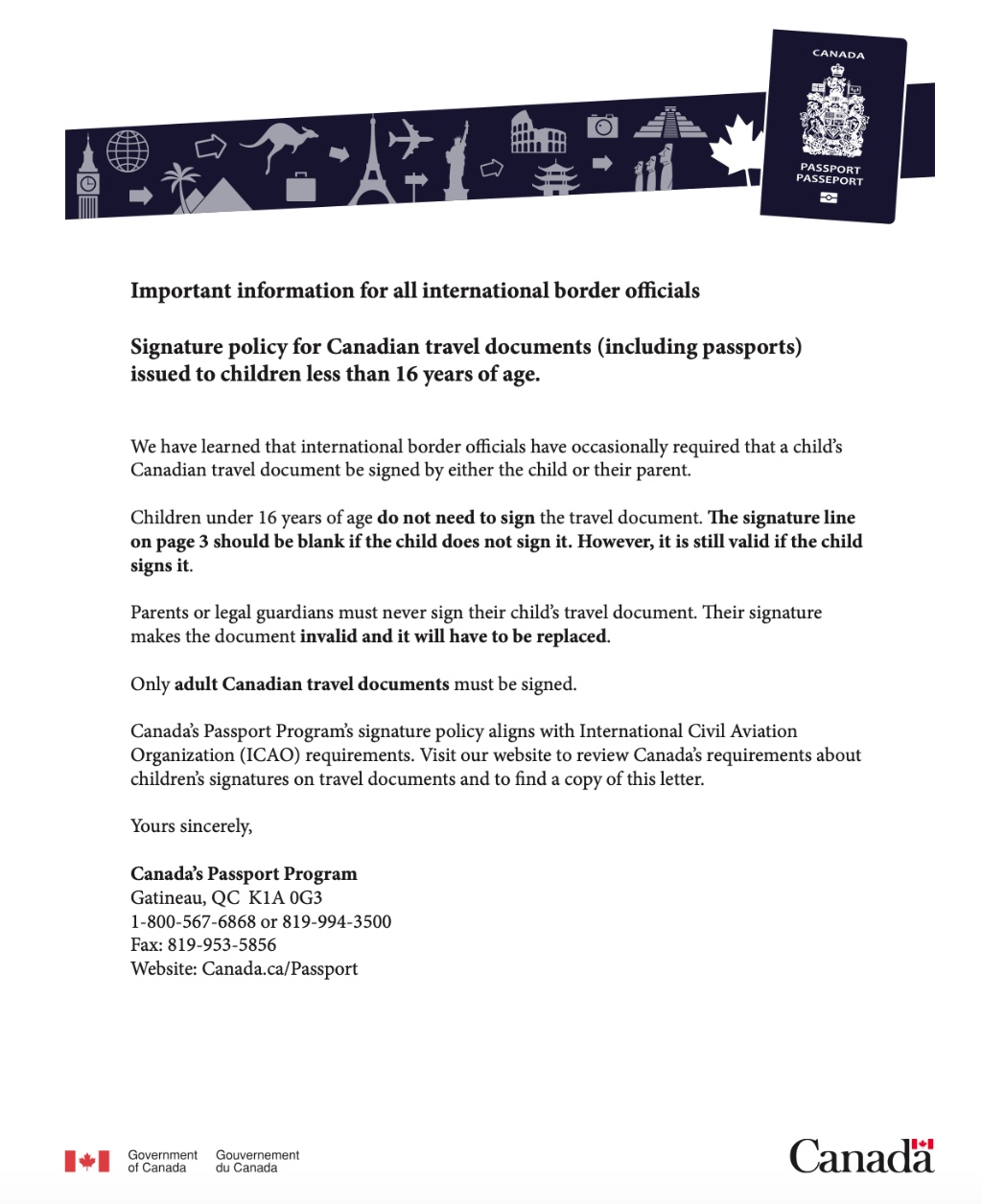 边境官员偶尔仍坚持要求父母/监护人签名在儿童的加拿大护照上签字。针对这些困难,护照部提供了有关儿童护照签名的政策摘要,该摘要可以从加拿大政府网站上打印,并由父母/监护人在进行国际旅行时携带。