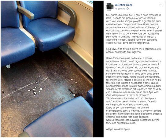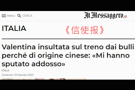 壹名19歲的華裔女孩18日在社交網絡臉書(Facebook)頁面上發布了壹條帖子,敘述其在火車上遭遇種族歧視的經歷,該貼文迅速引起安莎社、《晚郵報》、《信使報》等多個意大利主流媒體關注。