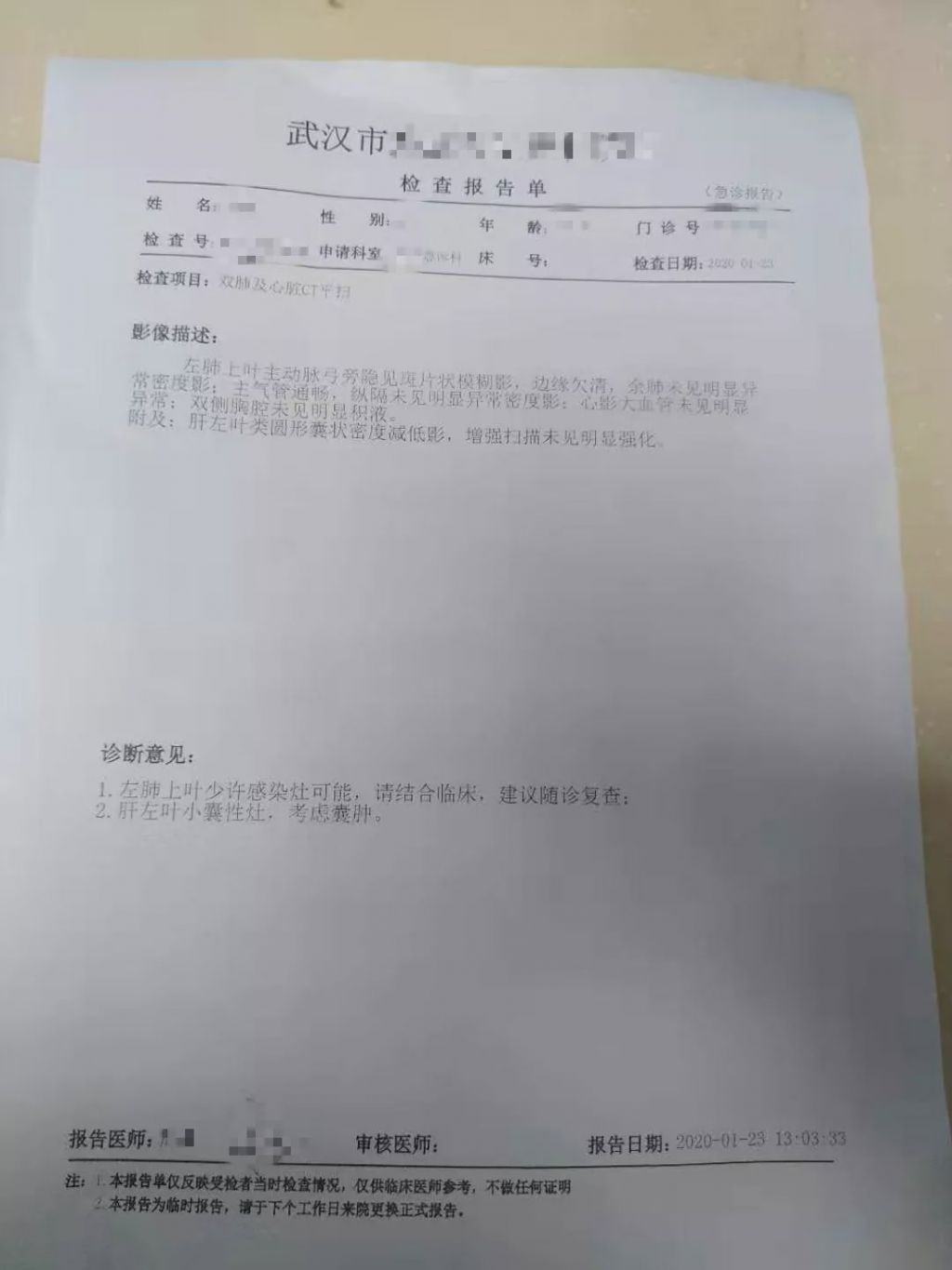1月23日早上下班回家後,中午出現低熱,我就去家附近的醫院做檢查。我跟醫生說,我有疑似病人接觸史。後來我的胸部CT顯示肺部有斑片狀的感染灶,符合疑似病例。我便請病假直接回家隔離休息了。