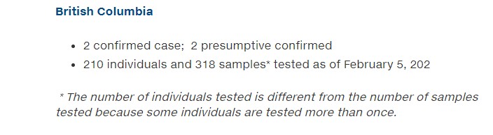 最新的數字顯示,截止2月5號星期叁,210名BC省人已經接受了新型冠狀病毒的檢測,只有4名被確認或被假定感染。