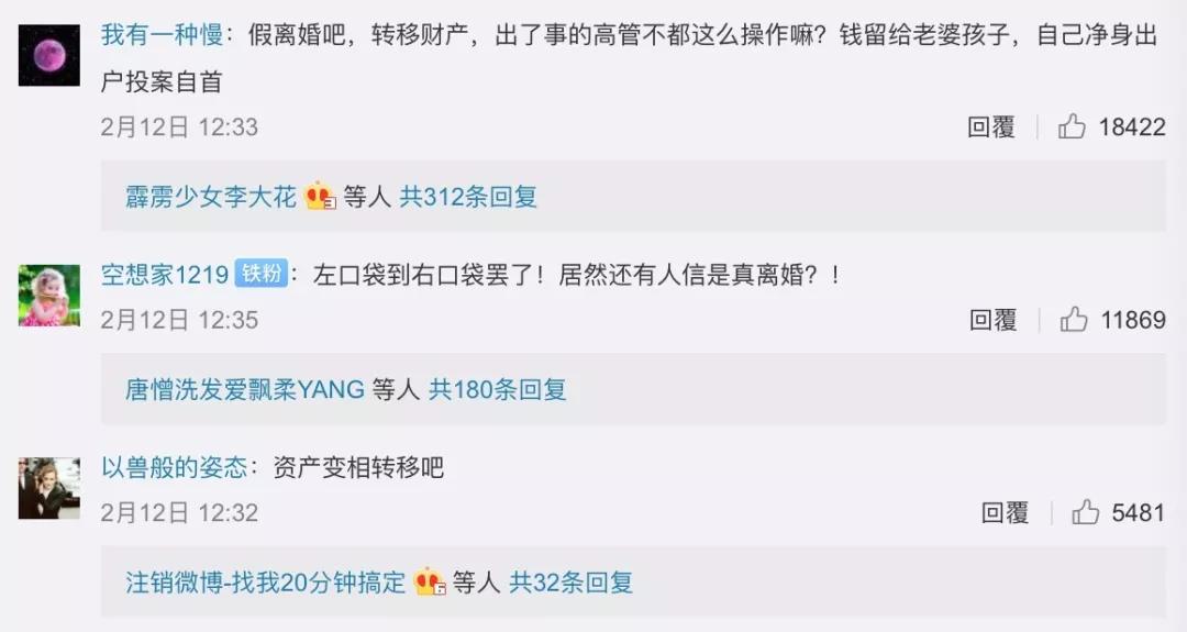 结果被更多网友群嘲,怕是“天真星球来的小公主”。绝大多数评论者,这一次似乎都坚定地选择相信爱情。他们用五花八门的修辞,发出相似的质疑:实乃假离婚,真资产转移。