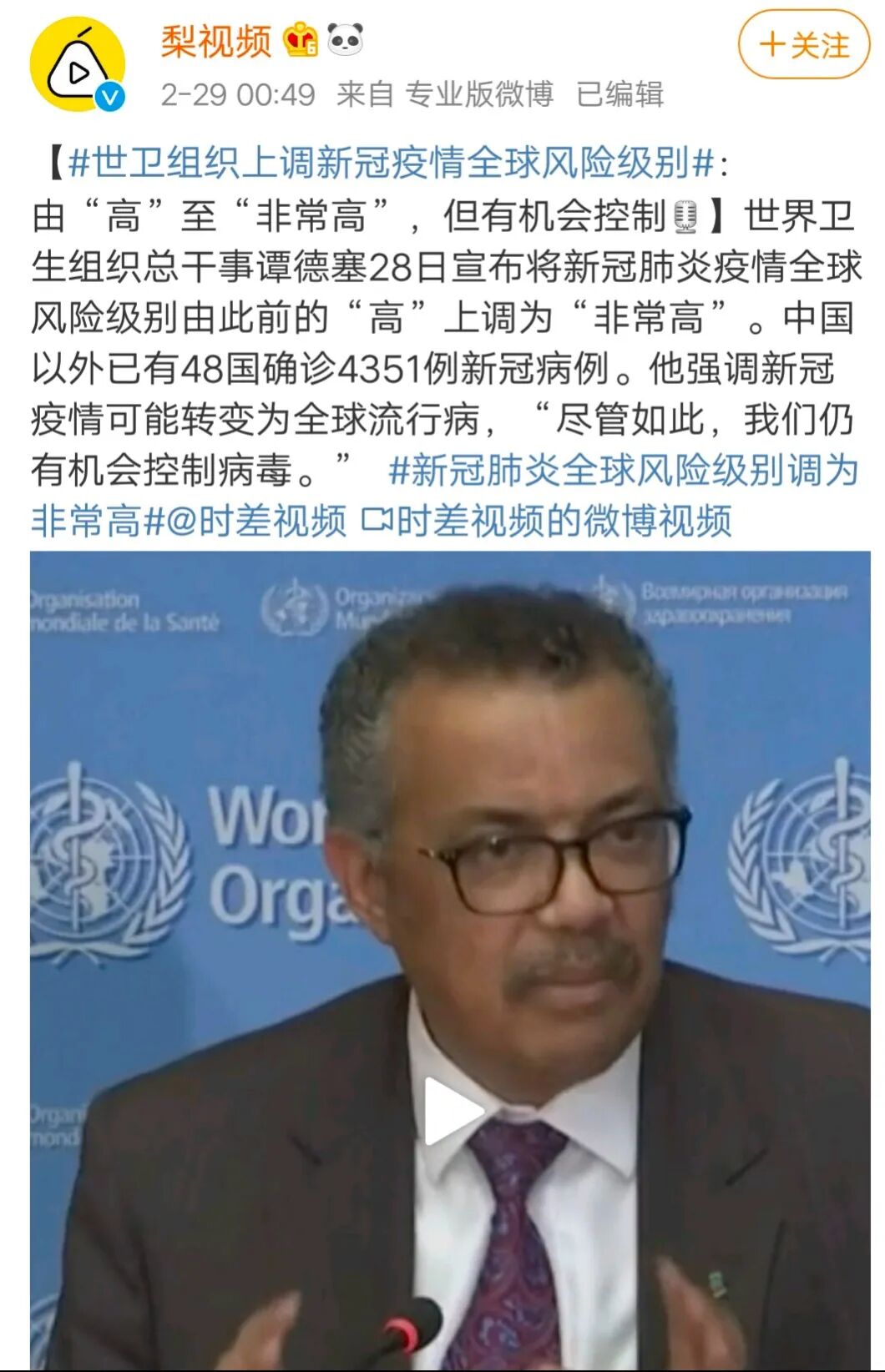 據WHO宣布,新冠疫情全球風險級別由“高”調為“非常高”,有可能轉變成全球流行病。