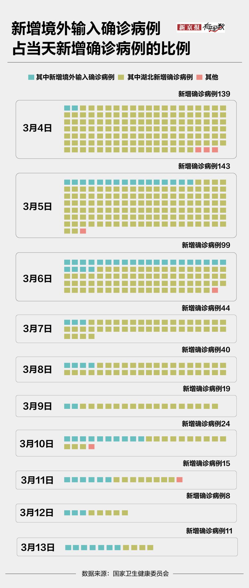 壹開始,湖北新增確診病例比境外輸入的多得多。但這幾天,新增境外輸入確診病例追了上來,在全國新增確診病例中所占的比例逐漸抬升。