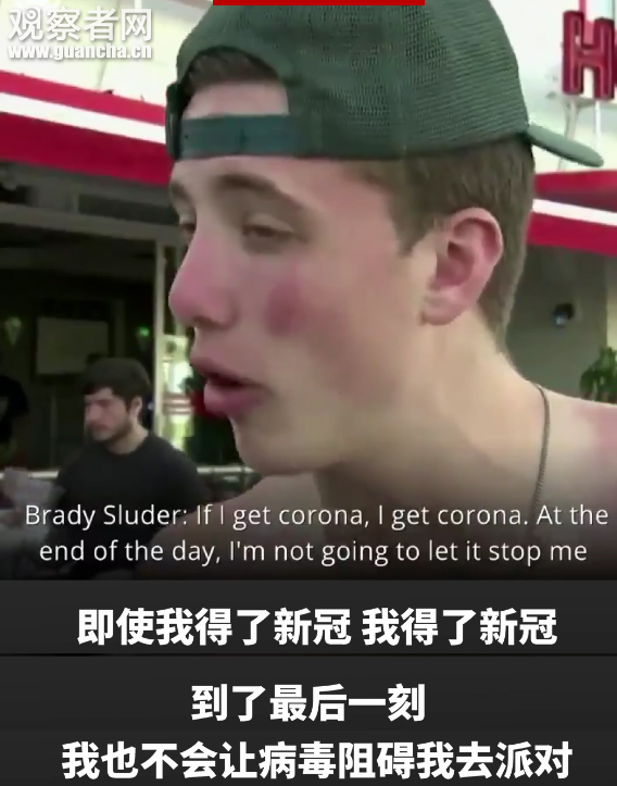 “就算我感染新冠病毒,到最后一刻,我都不会让它阻止我去参加派对”,布雷迪·斯洛德(Brady Sluder)说到,“我已经期待迈阿密春假很久了,我们计划这次旅行已经有两、三个月了”。