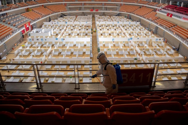 本月早些時候,武漢壹個體育館改造成的方艙醫院最後壹名病人出院後,工作人員對場地進行消殺。