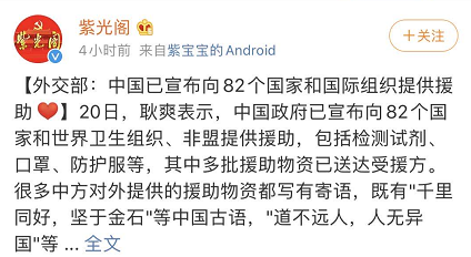 中國已宣布向82個國家和國際組織提供援助,在捐助資源的同時分享經驗,共同抗疫。