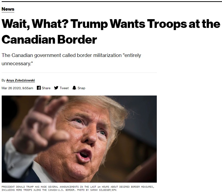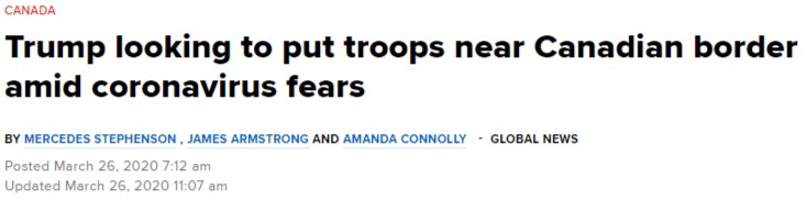消息人士對“環球新聞”(Global News)表示,鑒於美國對冠狀病毒大流行的邊境安全擔憂,美國總統川普白宮內部的美國政府官員正在考慮在美加邊境附近部署軍隊。