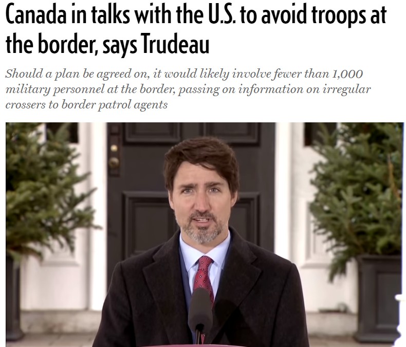 Trudeau表示,加國聯邦正在與美國政府協商,認為在美加邊境派兵駐守是非必須的、沒有意義的。