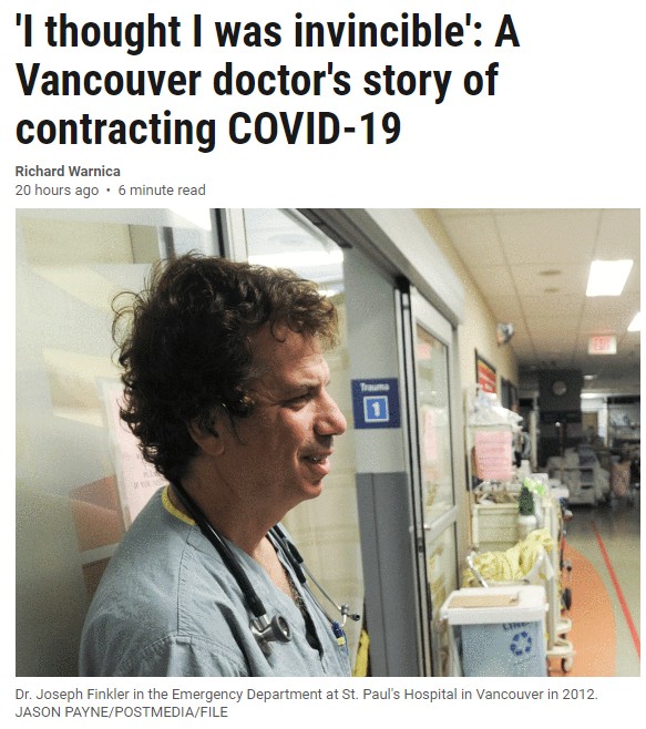 溫哥華聖保羅醫院急診室的壹位醫生,近日和國家郵報親述自己感染新冠病毒的經過,證明即使經過專業培訓,也可以輕松就忽略新寇COVID-19的症狀,