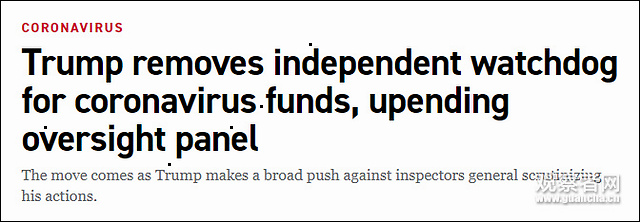 為應對新冠肺炎疫情,美國史詩級“2萬億美元刺激經濟法案”於上月底闖關成功,成為法案。法案中規定的2.2萬億美元要怎麼花?白宮會不會亂花?這本由壹位國會任命的獨立監察長負責監督。但在昨天,特朗普將其解職。
