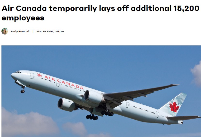 加拿大其他主要航空公司也引入了裁員計劃。 3月下旬,加拿大航空宣布臨時裁員15200名員工。