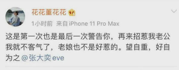蔣凡的緋聞源於4月17日,名為“花花董花花”的微博賬號發消息說,“這是第壹次也是最後壹次警告你,再來招惹我老公我就不客氣了,老娘也不是好惹的。望自重,好自為之@張大奕eve ”。