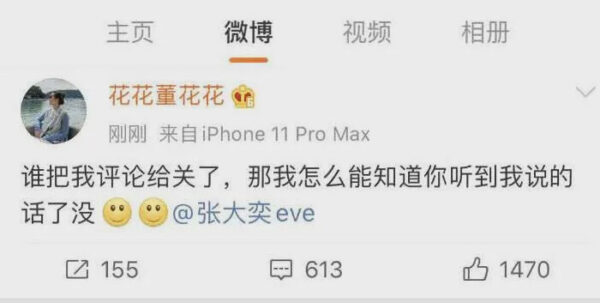 隨後,“花花董花花”再發微博稱,評論被關,並再次@張大奕,“誰把我評論關了,那我怎麼能知道你聽到我說的話了沒”。