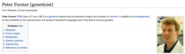 從維基百科上來看,科學家Peter Forster是英國皇家生物學會的院士、遺傳學家。主要研究領域為人類起源、語言的重建與傳播、以及法醫遺傳學。