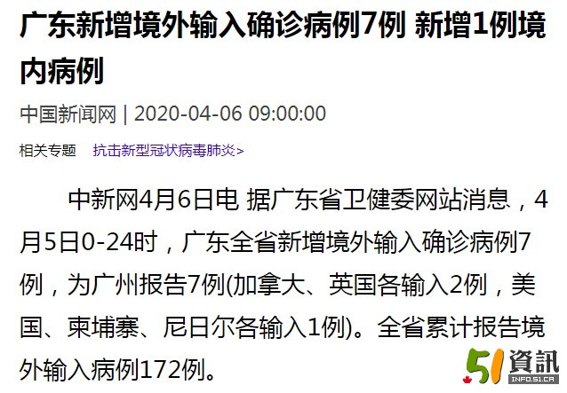 據中國媒體報道,34歲女子,中國廣東籍,近期在加拿大探親。4月1日,患者從加拿大溫哥華乘坐CZ330航班於2日抵達廣州白雲國際機場入境,即轉送至集中隔離點。4月4日,診斷為新冠肺炎確診病例。
