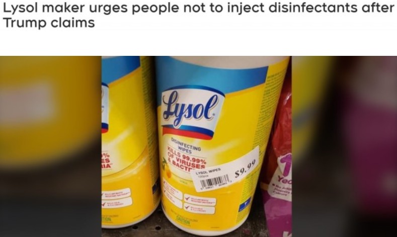 Lysol公司警告說,在任何情況下都不應注射或食用消毒劑。