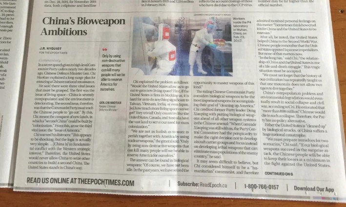 特刊內的文章稱COVID-19是中國人悄悄制造的生化武器,因此這種病毒應該被稱為“中共病毒”。