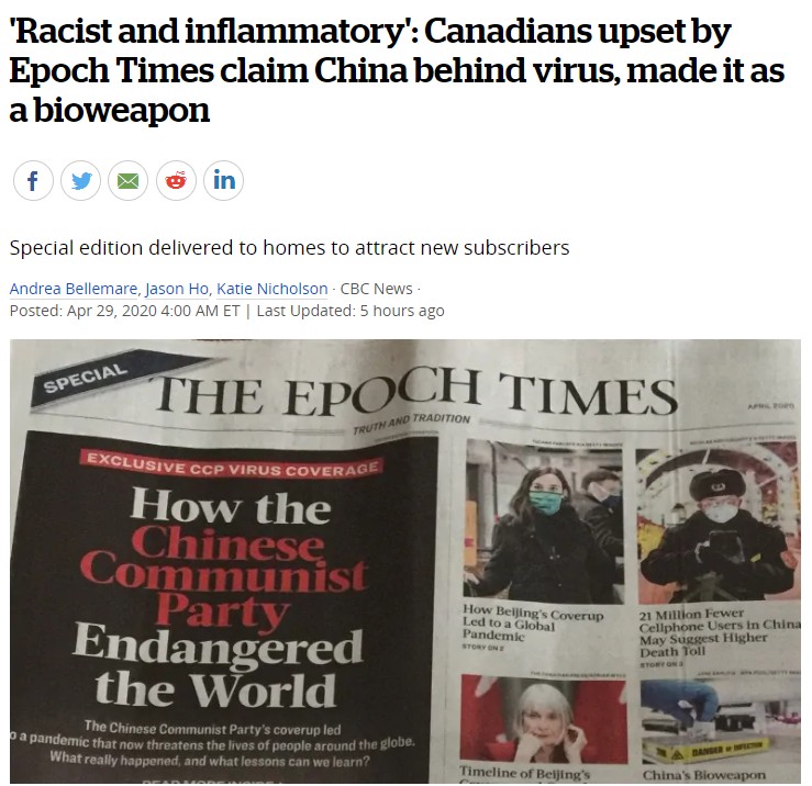 (加西網綜合)最近的壹份報紙稱COVID-19是中國人制造的生化武器,這種說法令加拿大人很是煩惱。