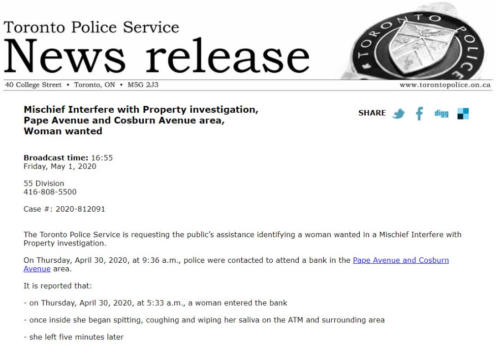 多倫多警方表示,這起事件發生在疫情爆發期,令人擔憂。警方稱該女子走到銀行裡,開始吐口水、咳嗽,還用她的唾液擦遍整個取款機及周圍區域。