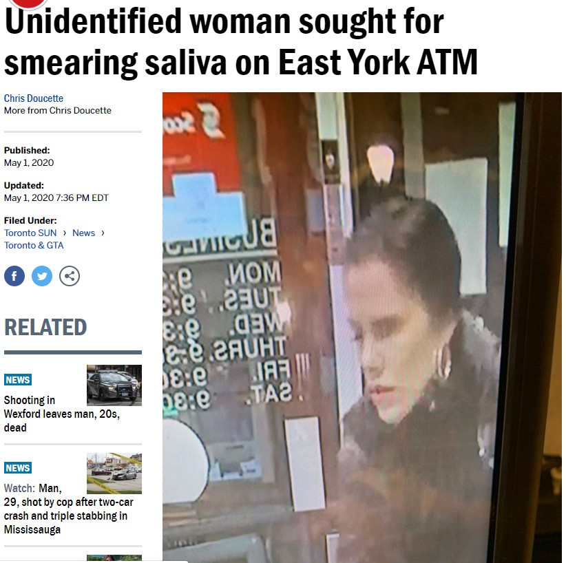 多倫多警方發出通告,尋求公眾的幫助,識別這名對著銀行提款機吐痰、咳嗽以及唾液的白人女子。