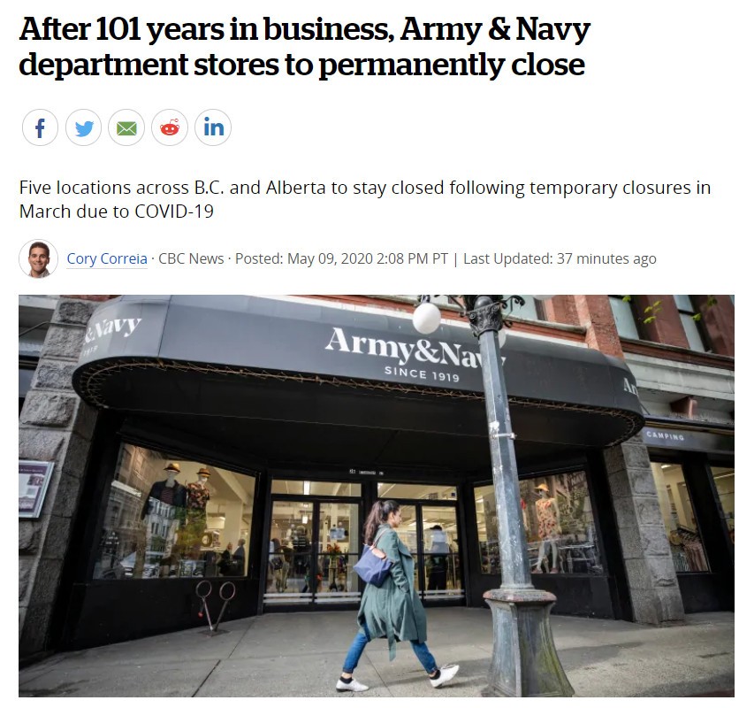 由於COVID-19疫情影響,繼叁月份臨時關閉後,在溫哥華營業超過101年的Army & Navy百貨連鎖店在BC和Alberta的伍個地點將正式關閉。
