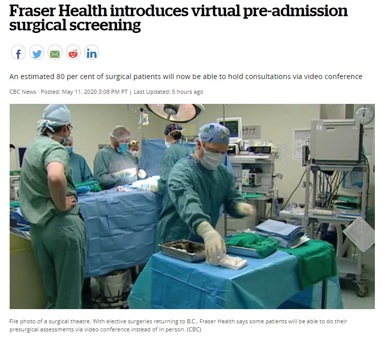 (加西网综合)据CBC News报道,菲沙卫生局(Fraser Health)正逐步恢复手术排期,并于近日表示,大多数需要入院进行术前评估的外科手术患者,现可以通过网上视频进行操作,免去亲自去医院,从而降低感染新冠肺炎的风险。估计约有80%的外科手术患者可以通过网络进行虚拟会诊和术前评估。