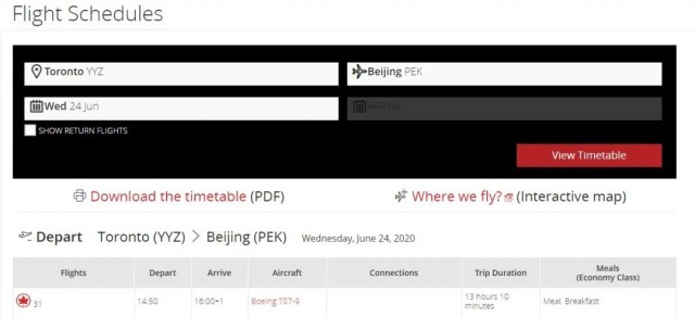 據加航官網顯示,6月24日有壹班從多倫多直飛北京的航班。