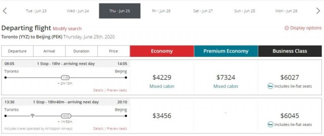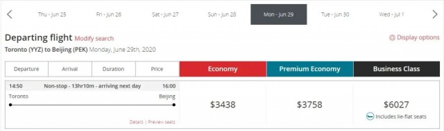 但不知道是不是因為機票數量有限,在訂購機票時已經看不到6月24日直飛往返多倫多-北京的機票了。而在6月25日有壹班在溫哥華中轉的航班,經濟艙票價為$4229!商務艙更是高達$6027!約3萬人民幣!