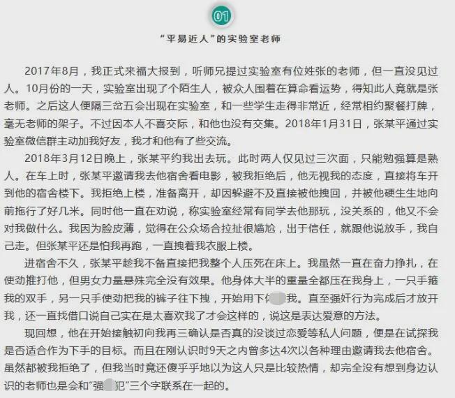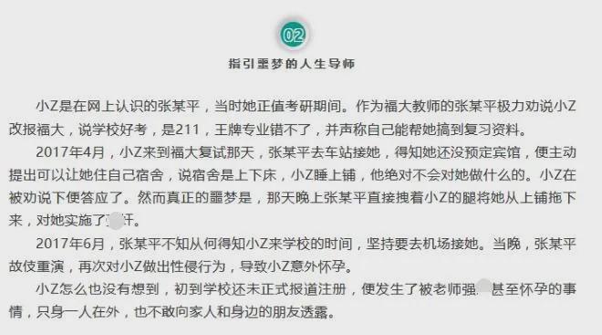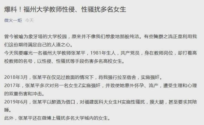 5 月 13 日上午,微博網友 @微火壹炬 爆料:福州大學教師張某平身在教師崗位,卻打著高校教師的名號,以性侵、性騷擾等手段傷害多名高校女生。爆料文章中稱,2017 年張某平多次對壹女生實施強奸,使其意外懷孕後流產。