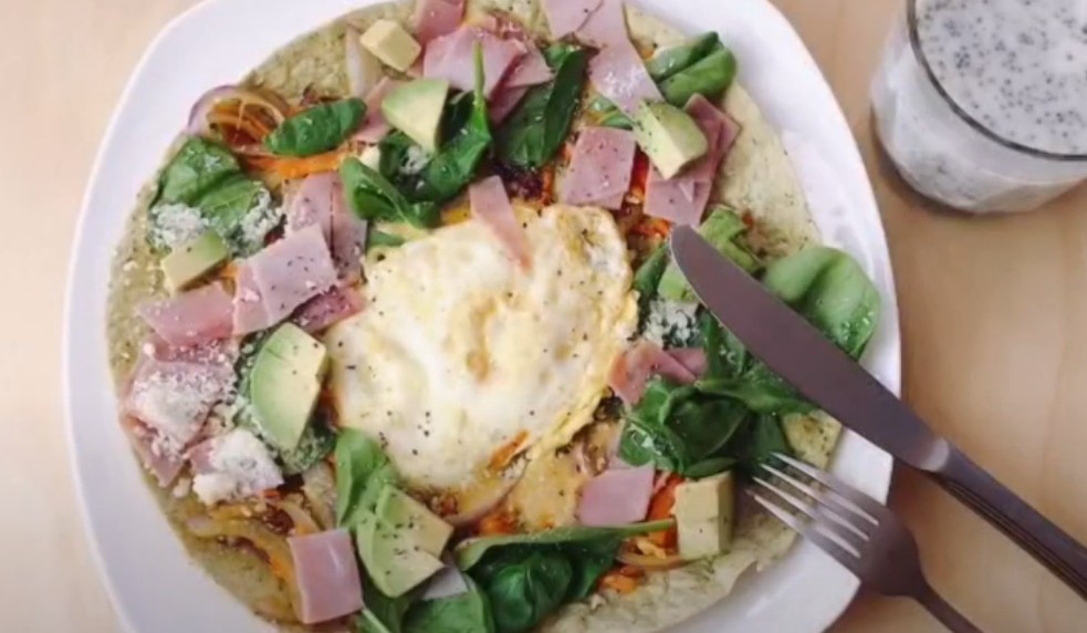 先倒入壹小杯無糖杏仁奶,加入奇亞籽,攪拌均勻,讓奇亞籽吸收水分。 然後准備蔬菜,先把小塊胡蘿卜,洋蔥切絲,鍋內小火倒入橄欖油,下胡蘿卜和洋蔥,炒軟撇到鍋的肆周,中間加少許橄欖油,煎個雞蛋,如果喜歡SUNNYSIDE 有不需要翻面。 蔬菜雞蛋熟了後盛入碗內備用。鍋內放入菠菜口味的墨西哥餅,壹定要最小火,放入小塊奶酪,均勻的鋪上煮熟的蔬菜,及有機小菠菜,和火腿片,在把雞蛋放在中間,撒上Parmesancheese, 出鍋裝盤後放上小塊切丁的牛油果,黑胡椒調味。