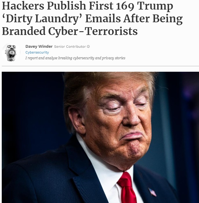 據報道,黑客此前曾揚言,如果沒人出價,他們將公開發布川普的秘密文件。由於被稱為“網絡恐怖分子”激怒了黑客,於是他們發布了其中的169封電子郵件。隨後,很快壹個神秘買家現身,將川普的資料全部買走。