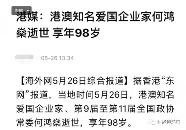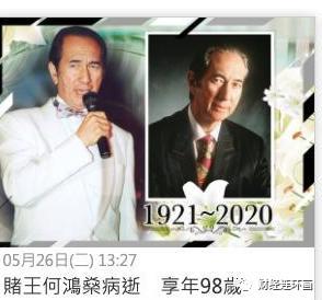 2020 年 5 月 26 日,港媒爆料稱,叱吒風雲壹生的賭王何鴻熡z謁 98 歲這年病逝。