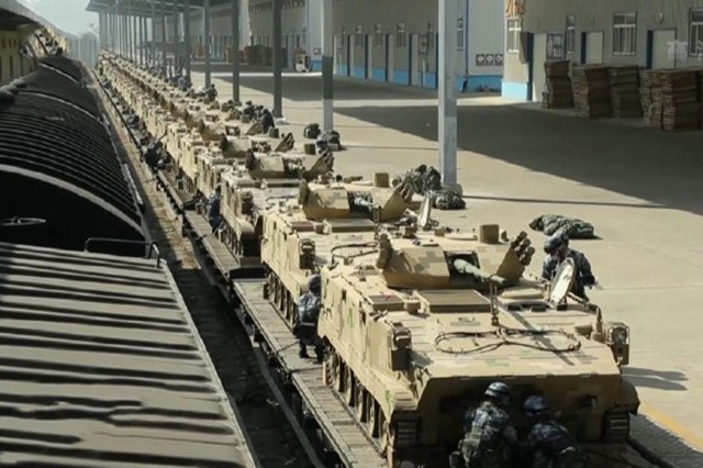 解放軍集結兵力在中印邊境,大量先進的武器裝備正運往邊境地區。(中國央視截圖)