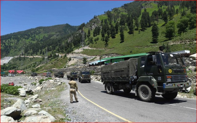 周一,印度军队的卡车开往印度北部的中印边境的拉达克地区。中印两国上周卷入了一场致命的冲突。