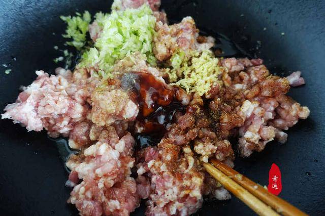 2、先在豬肉餡中放入蔥姜末、拾叁香、胡椒粉、生抽、蠔油、食用油、香油、鹽,然後用筷子攪拌均勻備用。