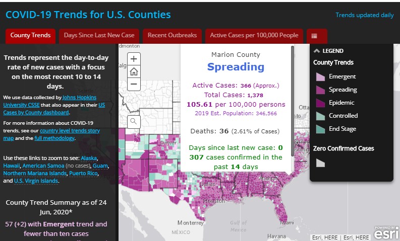 空间分析公司Esri编制的彩色编码数据图对县一级跟踪新的COVID-19病例数显示:美国南部和西南部的大部分地区正出现新的冠状病毒感染的“流行趋势”或“传播趋势”。