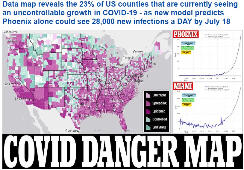 6月24日,据《每日邮报》报道,最新数据显示,本周美国23%县市已经失控,因为新冠确诊病例继续以令人不安的速度激增。