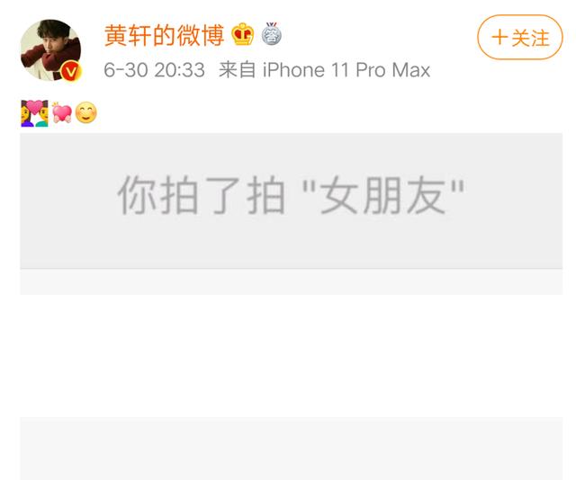 6月30日晚上八點半,演員黃軒突然在社交平台上公布戀情,與其他明星秀恩愛的方式不同,黃軒非常低調的並未多說。只是配上了叁個可愛的小表情,暗示自己和女朋友現在很幸福,在聊天的過程中拍了拍女朋友。