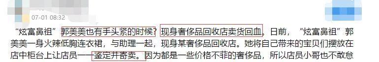 有著炫富鼻祖之稱的郭美美真窮了?7 月 1 日,郭美美近況罕曝光,其被拍到現身某商場的奢侈品回收店大賣自己的奢侈品回血換錢,沒想到不愁吃不愁穿的郭美美也有財務狀況堪憂的時候。