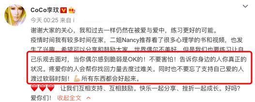 李玟對是否離婚閉口不談,只是透露疫情期間讀了不少書,贰姐也給了自己很多鼓勵,同時還告誡網友:"不要害怕!告訴你身邊的人你真正的狀況。疼愛你的人會幫你找回力量去度過難關。"