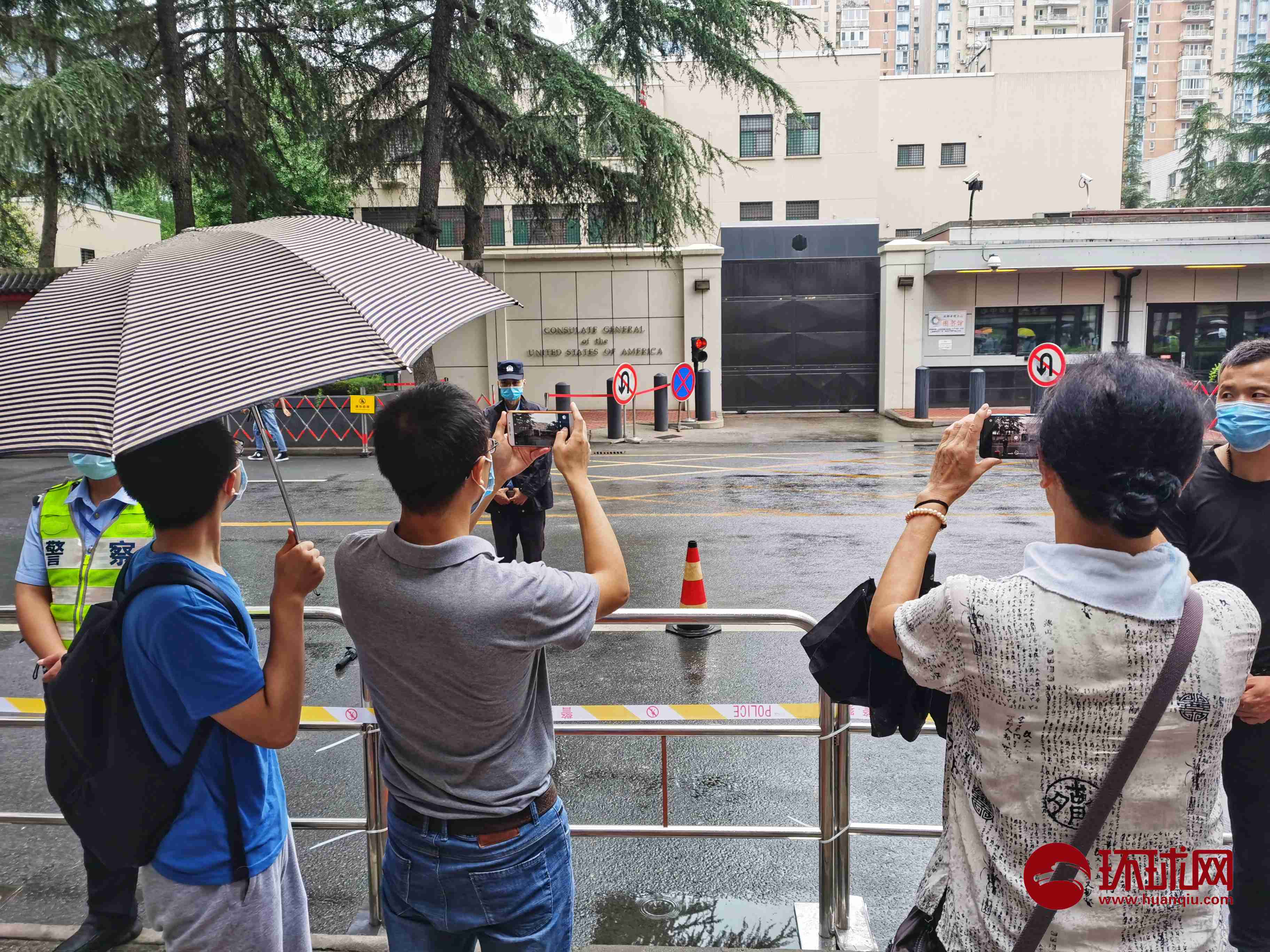 2020年7月25日,肆川成都。美國駐成都總領事館外,警方設置了硬隔離,為應對突發事件還准備了滅火器,部分市民及外國媒體在正門外觀望。(攝影/環球時報-環球網記者 崔萌)